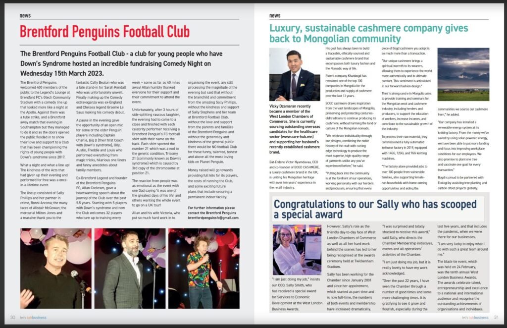 The lovely Sally Smith, the COO of the West London Chamber of Commerce attended our fantastic Comedy Night at the Brentford GTech Stadium. She was so impressed by the night and what we do that she offered an article to be published about us in the Chamber’s Let’s Talk Business magazine (May 2023 edition).